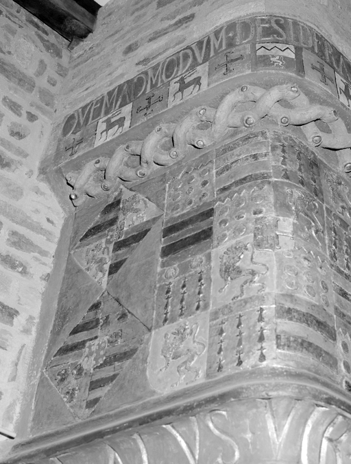 Tour sud-ouest, deuxième niveau - Cheminée, côté gauche de la hotte,détail de blason.Immatriculation