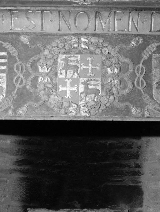 Tour sud-ouest, deuxième niveau - Cheminée, partie centrale du linteau, détail d'un blason.Immatriculation