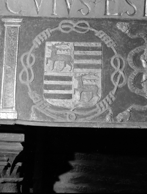 Tour sud-ouest, deuxième niveau - Cheminée, partie gauche du linteau, détail d'un blason.Immatriculation