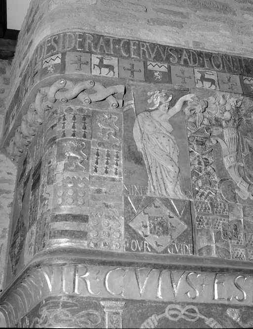 Tour sud-ouest, deuxième niveau - Cheminée, partie gauche de la hotte, détail de Minerve.Immatriculation