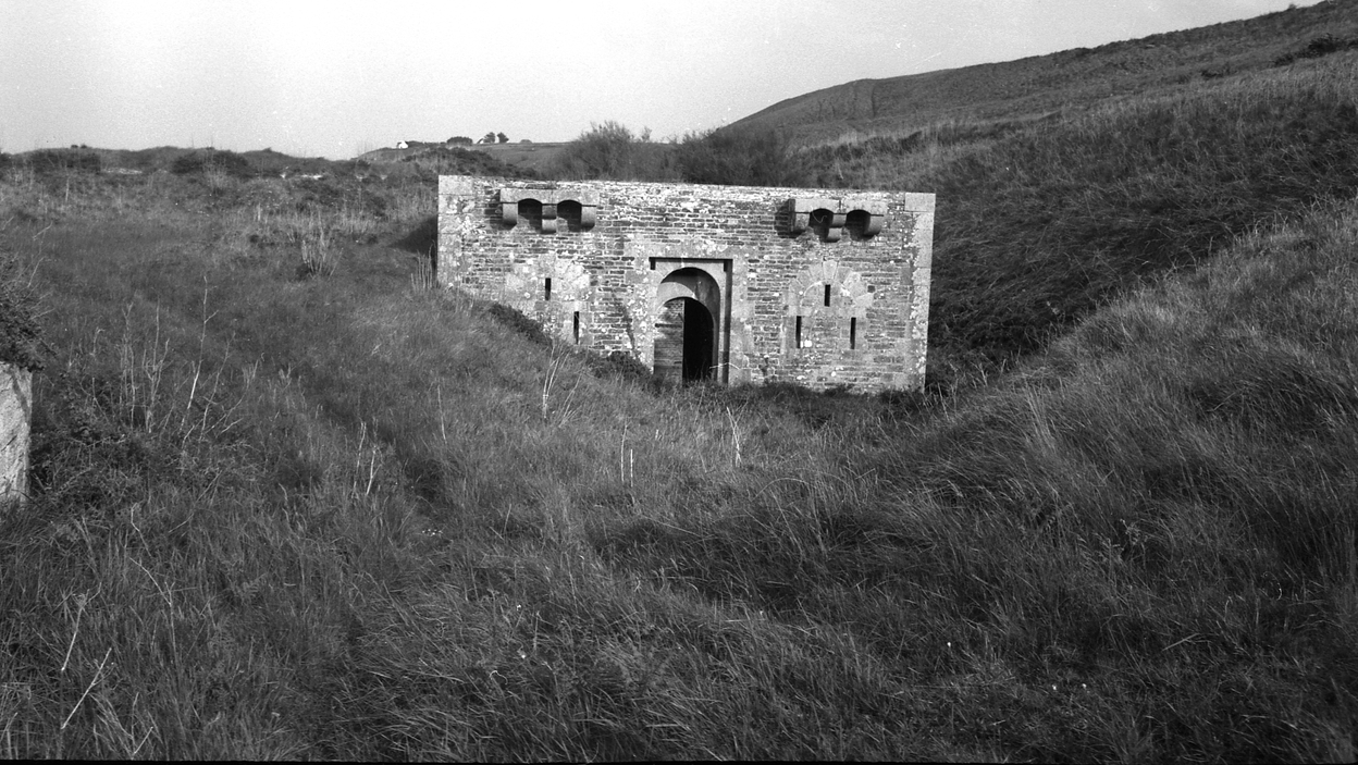 Locmaria, Grands Sables, batterie de La Ferrière, corps de garde crénelé, état dans les années 1970.Immatriculation
