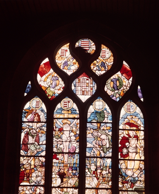 Verrière (maîtresse-vitre) : Passion, Résurrection, Jugement dernier, église Paroissiale Saint Hernin (Locarn),
