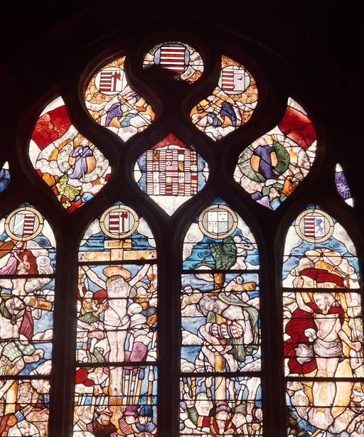 Verrière (maîtresse-vitre) : Passion, Résurrection, Jugement dernier, église Paroissiale Saint Hernin (Locarn),