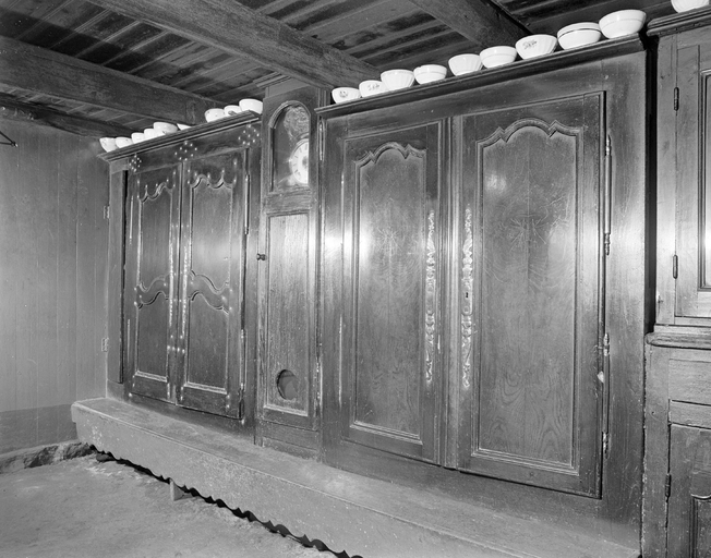 Mur nord, front des armoires 3 : armoires, horloge, "bank koste'n ti" et rangée de bols sur la corniche. (1977)Immatriculation