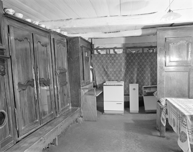 Salle commune 4, vue générale vers l'est. Mur nord : front des armoires (armoires, horloge, lit-clos près du feu et "bank Koste'n ti"). Mur sud : drustuilh en place et table à manger. (1977)Immatriculation