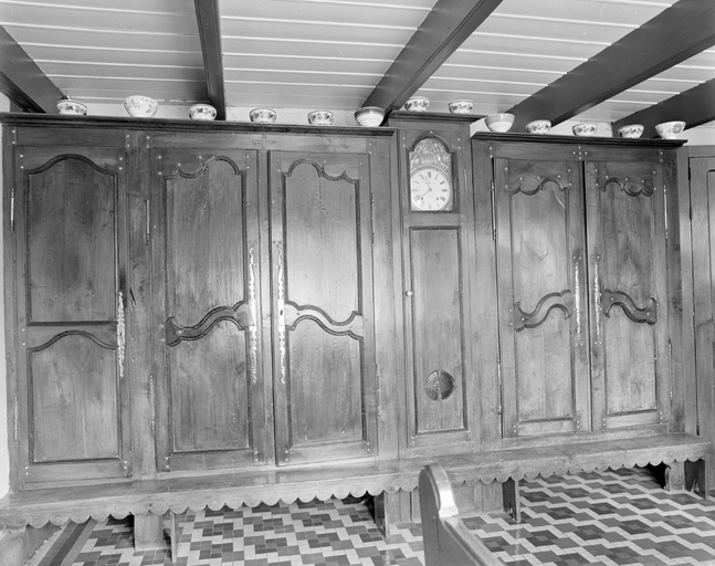 Mur nord, front des armoires 5 : armoires, horloge, "bank koste'n ti" et rangée de bols sur la corniche. (1977)Immatriculation