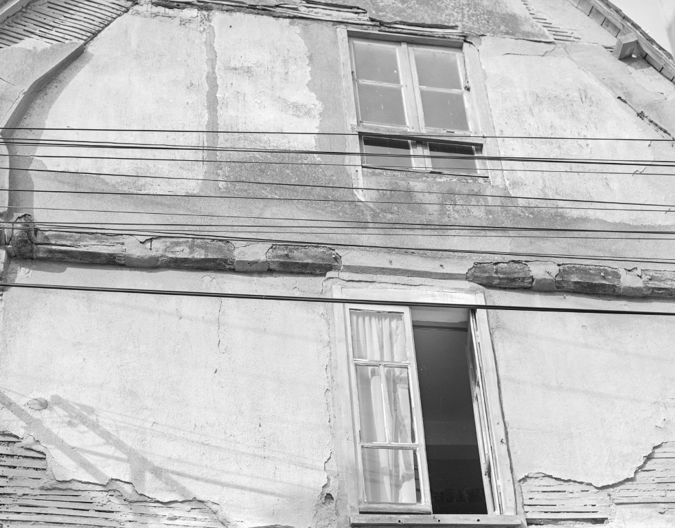 L'enduit, dégradé, laisse apercevoir le lattis.Immatriculation