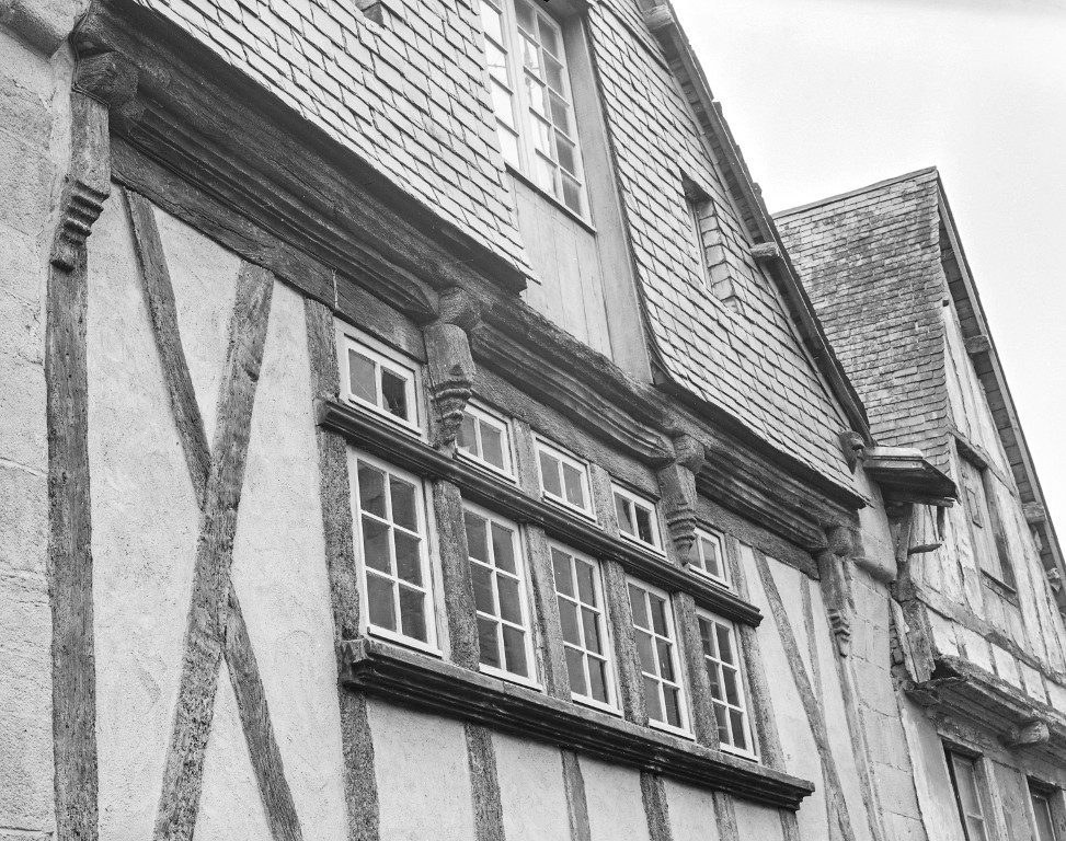 Etage en pan de bois. Les poteaux principaux ont leur tête élargie pour former des pigeâtres (état en 1978).Immatriculation