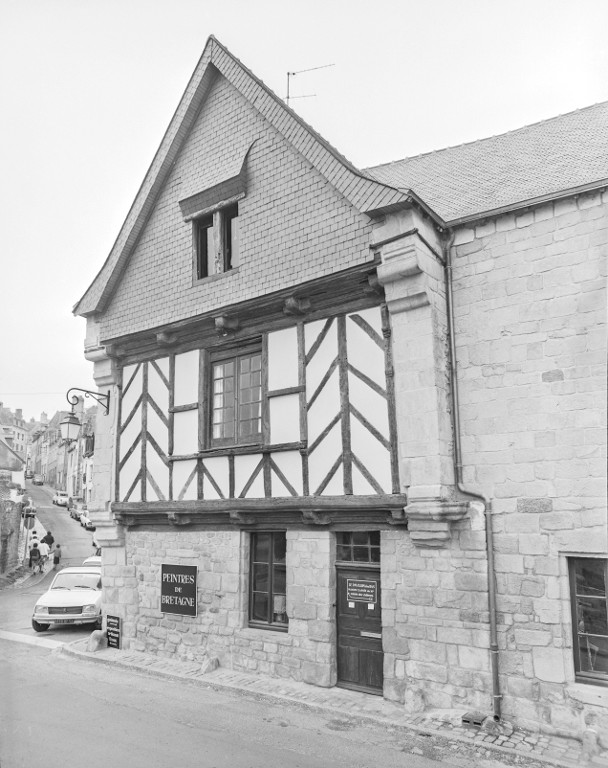 Façade sur rue dont l'étage en pan de bois est en encorbellement (maison de gauche).Immatriculation
