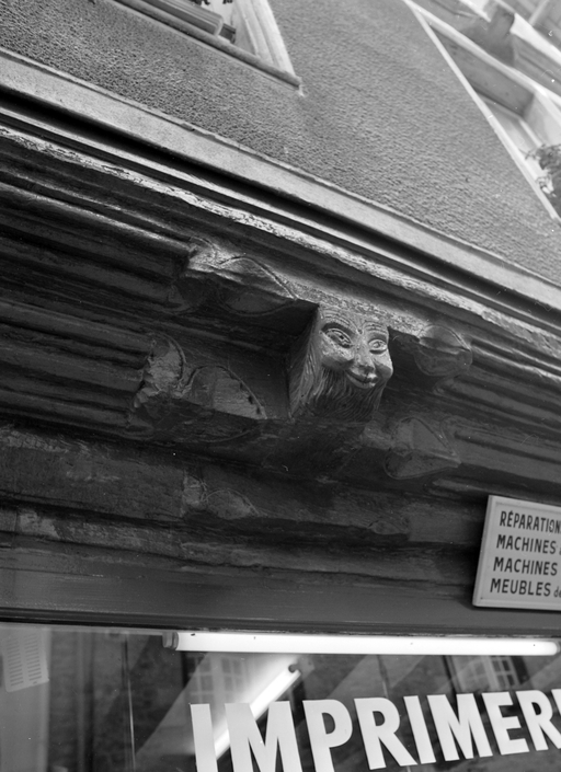 Un décor similaire se développe sur les sablières et entretoises. La sculpture de l'about de solive est postérieure (état en 1978).Immatriculation