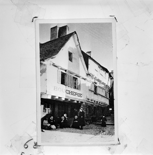 Cette maison à très fort encorbellement abrite un commerce au rez-de-chaussée, ici une boucherie (Collection Ségard).Immatriculation