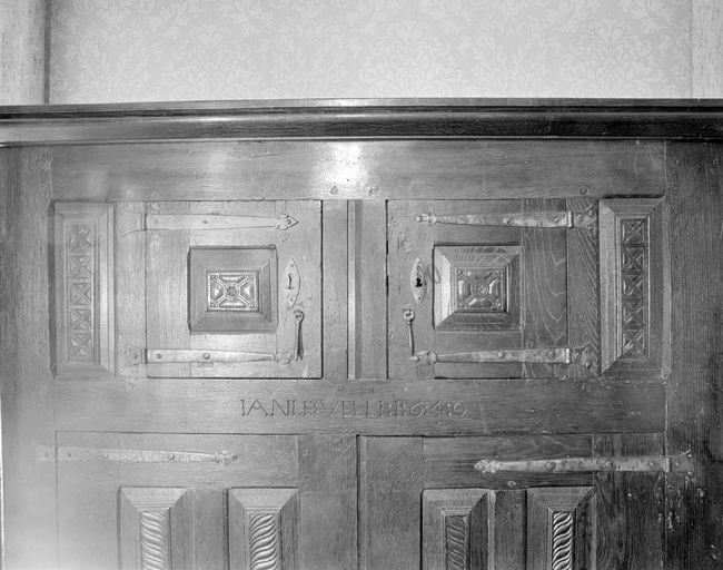 Buffet 1 daté 1640, vue rapprochée et détail de l'inscription : IAN : LE : VELLI : 1 : 6 : 4 : 0. (1979)Immatriculation