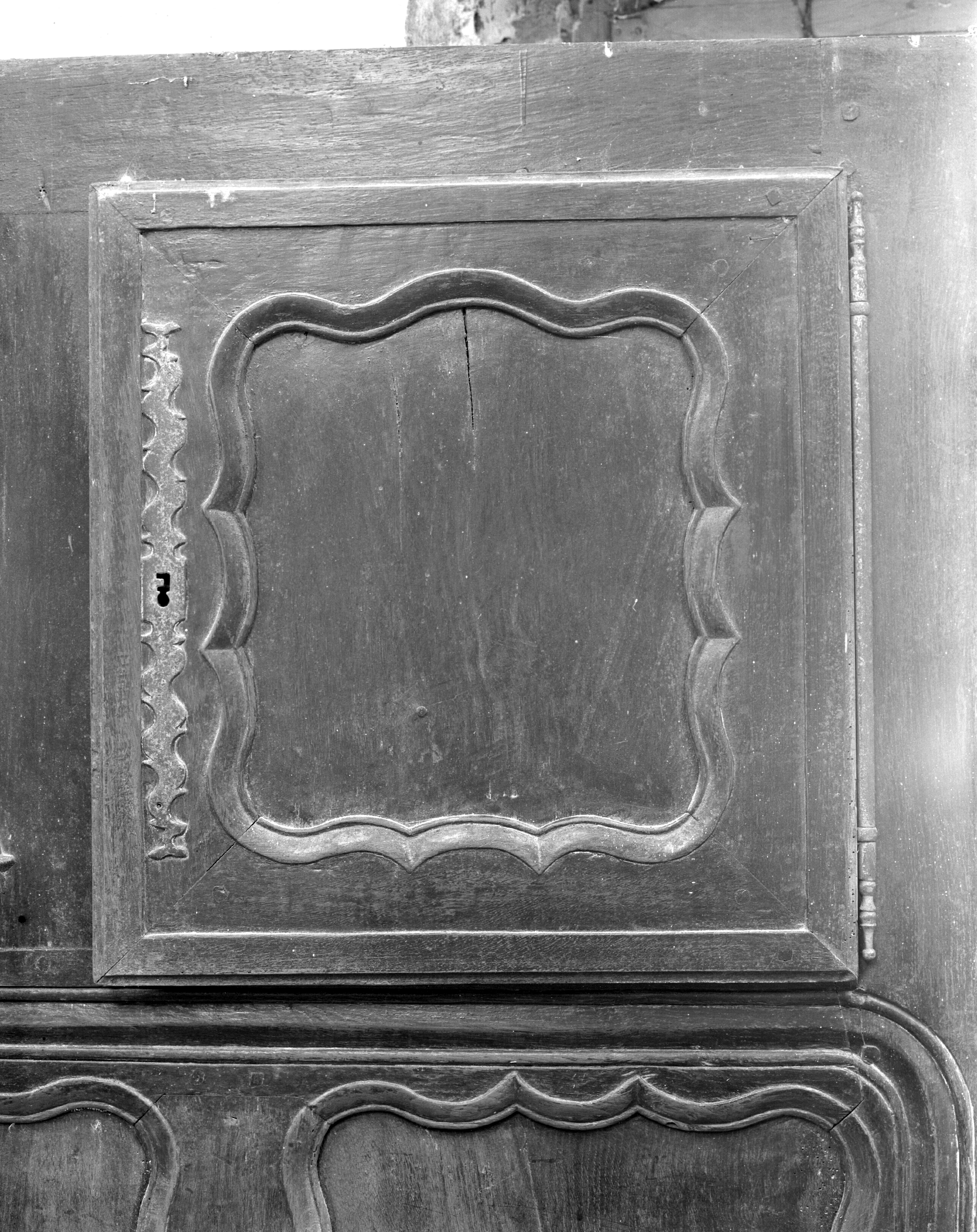 Drustuilh 7 daté 1831, détail d'une porte à panneau chantourné. (1979)Immatriculation