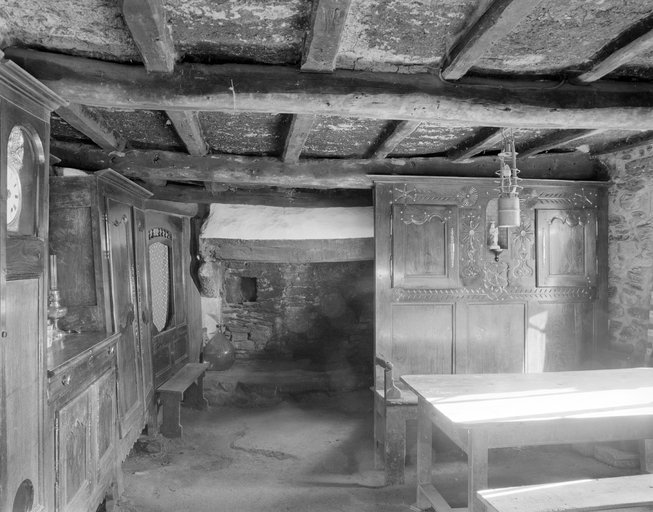 Esquibien, salle commune meublée de façon traditionnelle. Le drustuilh est à sa place, contre le mur sud. (1979)Immatriculation