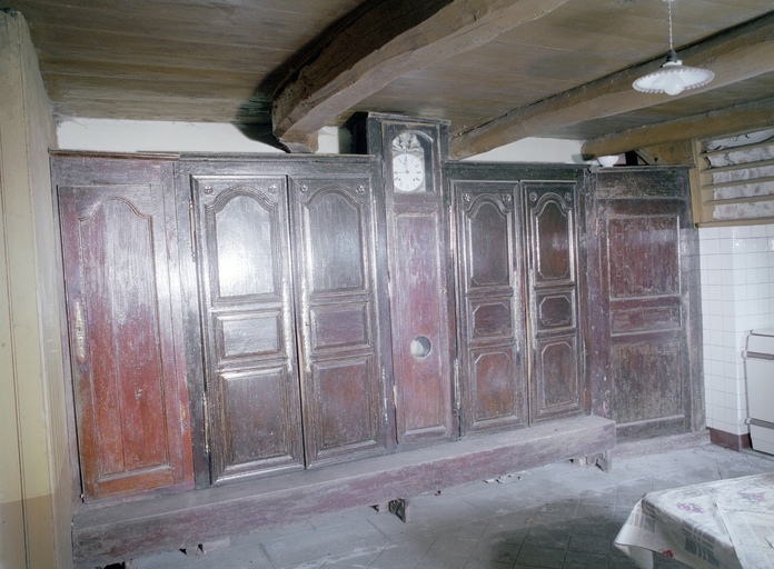 Mur nord, front des armoires 10 : armoires, horloge et "bank koste'n ti". (1979)Immatriculation