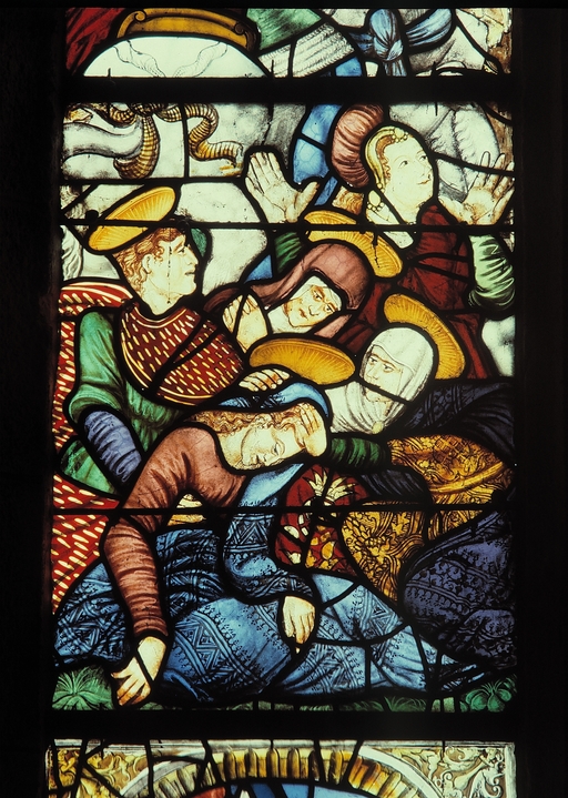Verrière (maîtresse-vitre) : Passion, Résurrection, Jugement dernier, église Paroissiale Saint Hernin (Locarn),