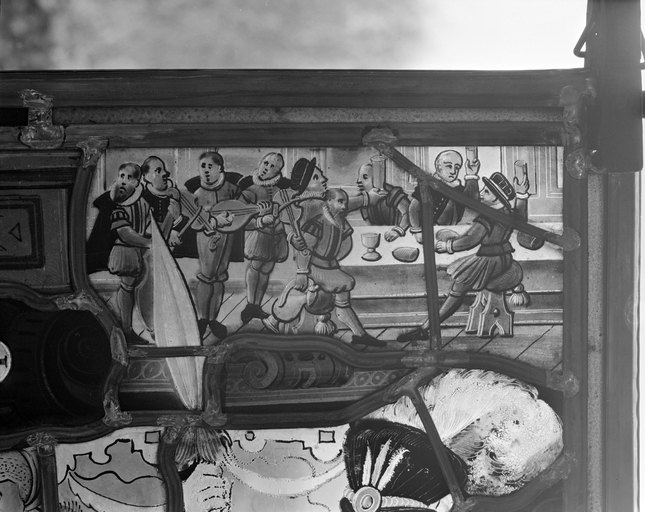 Lanvellec, Rosanbo : château, panneau B, partie supérieure, détail, côté droit, festin (après restauration)Immatriculation