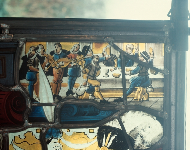 Lanvellec, Rosanbo : château, panneau B, partie supérieure, détail, côté droit, festin (après restauration)Immatriculation