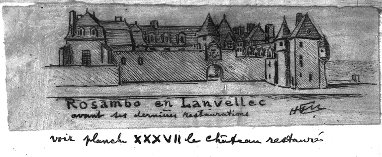 Dessin de Henri Frotier de la Messelière, vers 1930 : élévation est comprenant l'entrée à porte charretière surmontée d'armoiries, le pavillon nord-est, la chapelle et le chartrier dans l'angle sud-estImmatriculation