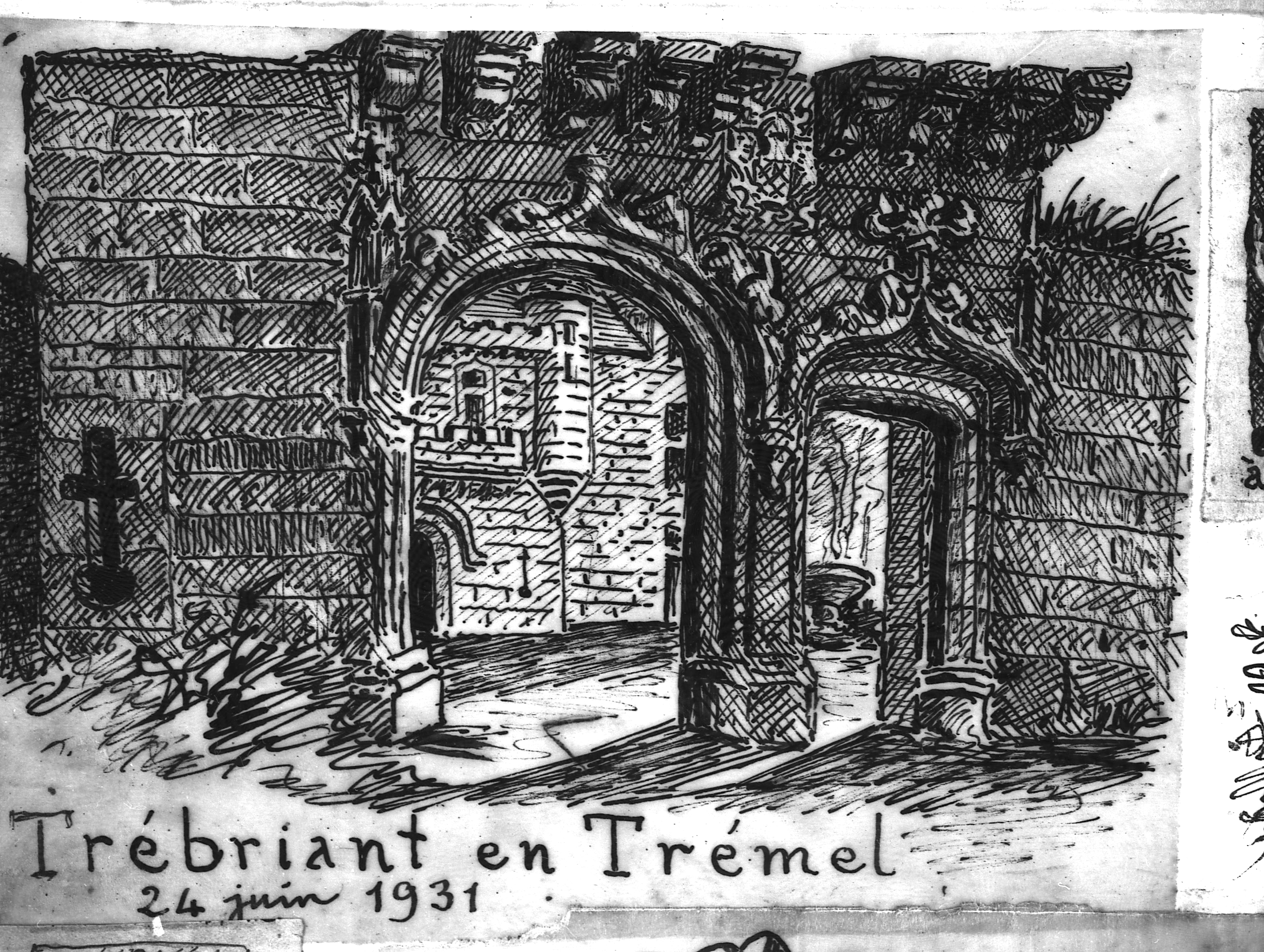 Trémel : manoir de Trébriant, vue du portail d'entrée (portes piétonne et charretière de style Gothique), croquis par Henri Frotier de la Messelière, 24 juin 1931Immatriculation