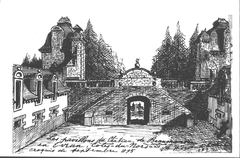 Croquis, les pavillons du château de Beaumanoir en Evran construit en 1628, septembre 1895.Immatriculation