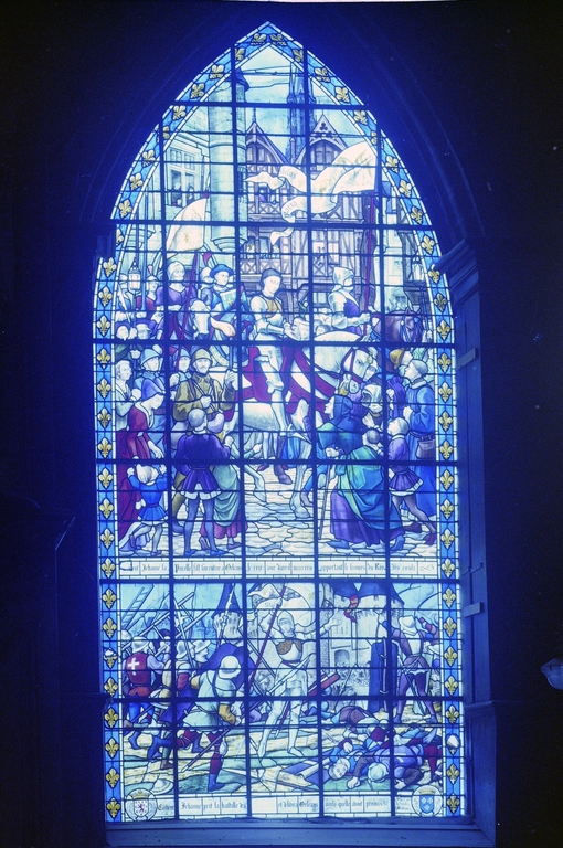 Verrière (9) : vie du Christ, Jeanne d'Arc délivrant Orléans, Apparition de la Vierge, sainte Anne et saint Joachim, saint Crépin et saint Crépinien, martyre de sainte Félicité, saint Michel, saint Gabriel, saint Raphaël (1 (2, 3, 4, 9) 1, 13, 14, 16), église paroissiale Saint-Sulpice (Fougères),