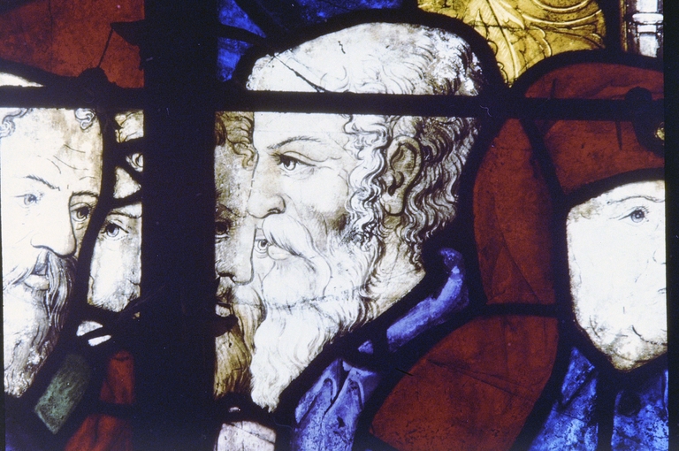 Mur nord, vitrail, la femme adultère : panneau B3, détail tête.Immatriculation