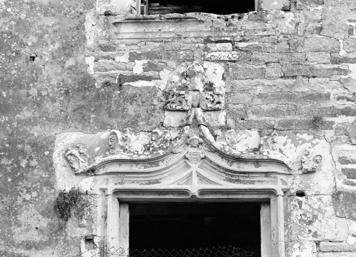 Elévation antérieure, rez-de-chaussée, fenêtre de droite : détail de l'accolade avec écu.Immatriculation