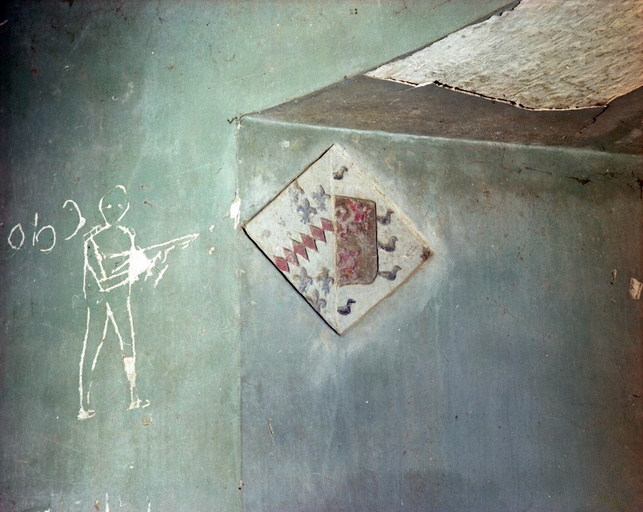 Escalier, écu, ébrasement de la fenêtre entre rez-de-chaussée et étage.Immatriculation