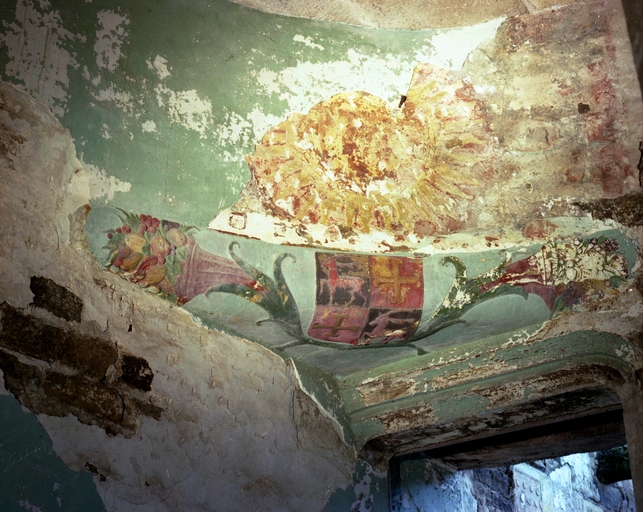 Etage, escalier, porte d'accès au corps central : décor peint et sculpté.Immatriculation