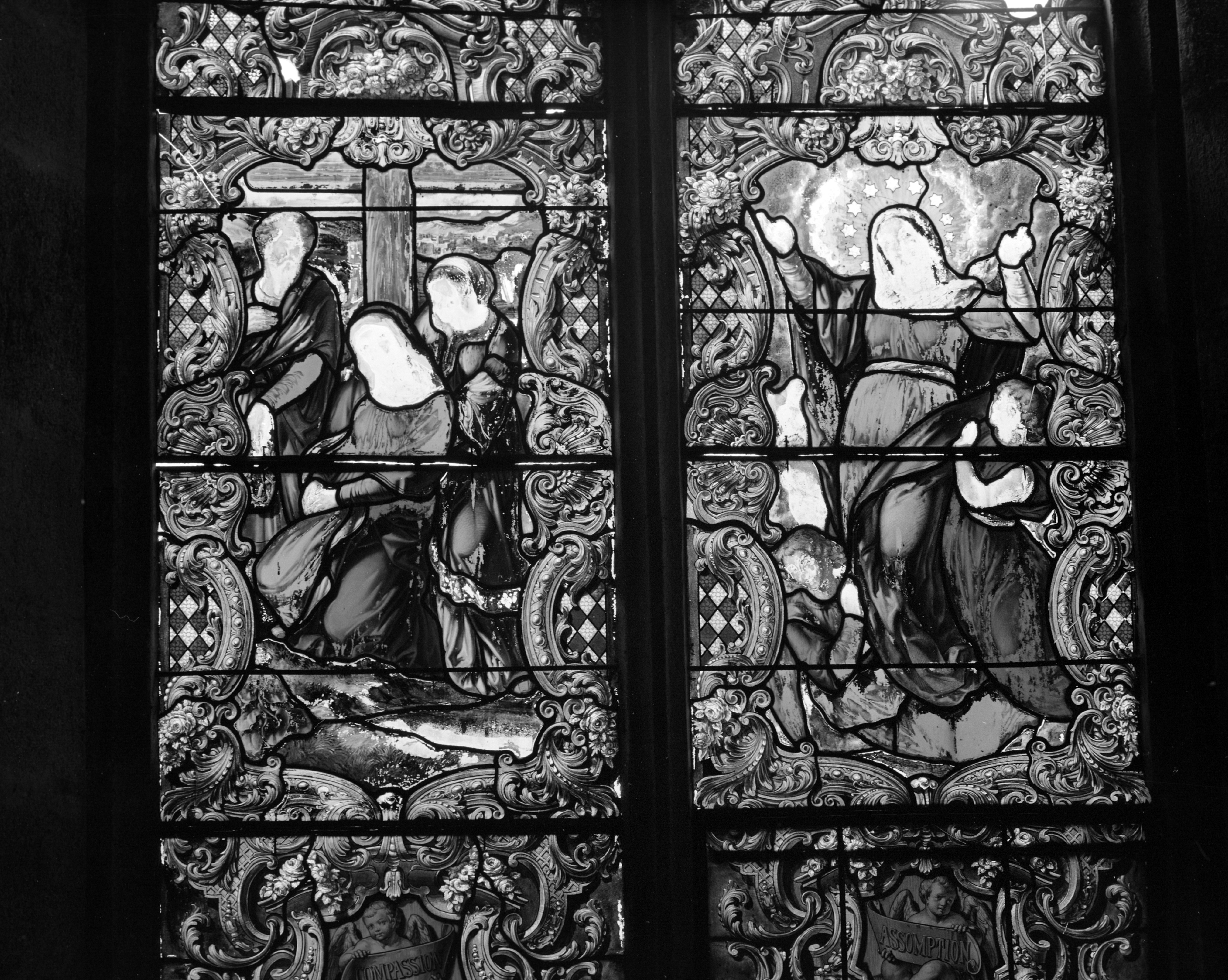 Chapelle, vitrail, la Compassion et l'Assomption de la Vierge, détail.Immatriculation