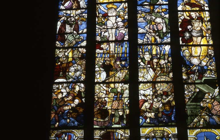 Verrière (maîtresse-vitre) : Passion, Résurrection, Jugement dernier, église Paroissiale Saint Hernin (Locarn),