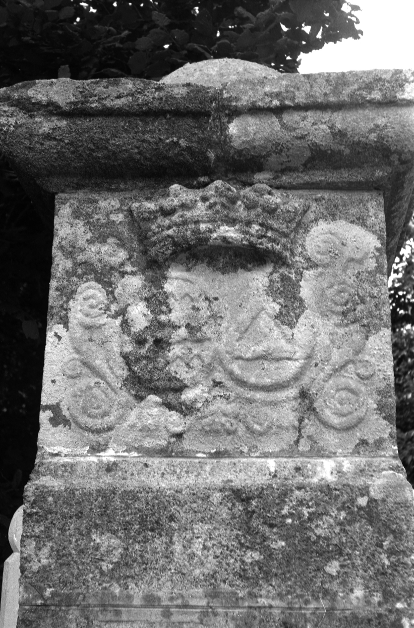 Vue de l'un des piliers de l'entrée : détail des armoiries (état en 1983)Immatriculation