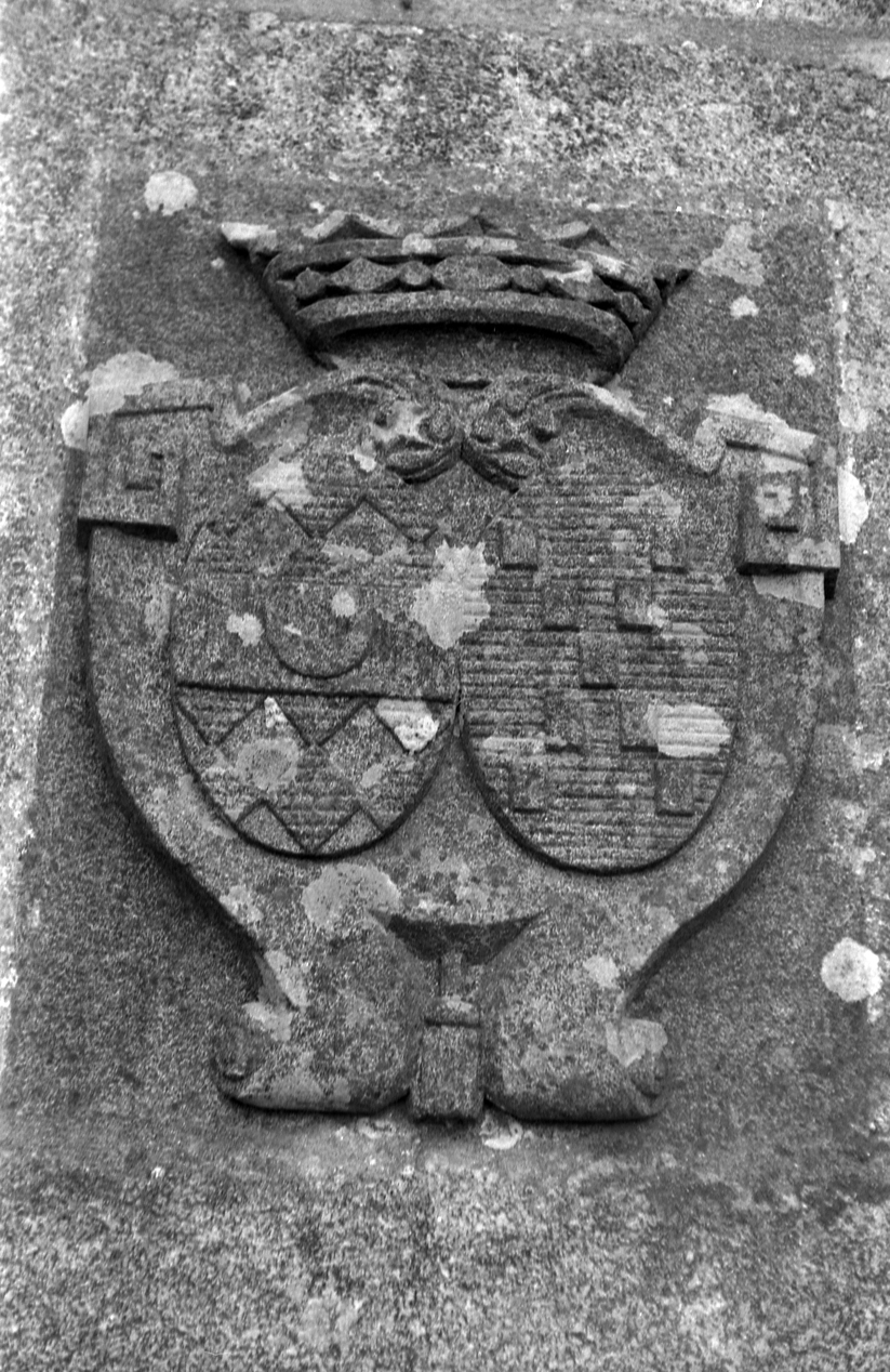 Vue de l'un des piliers de l'entrée : détail des armoiries (état en 1983)Immatriculation