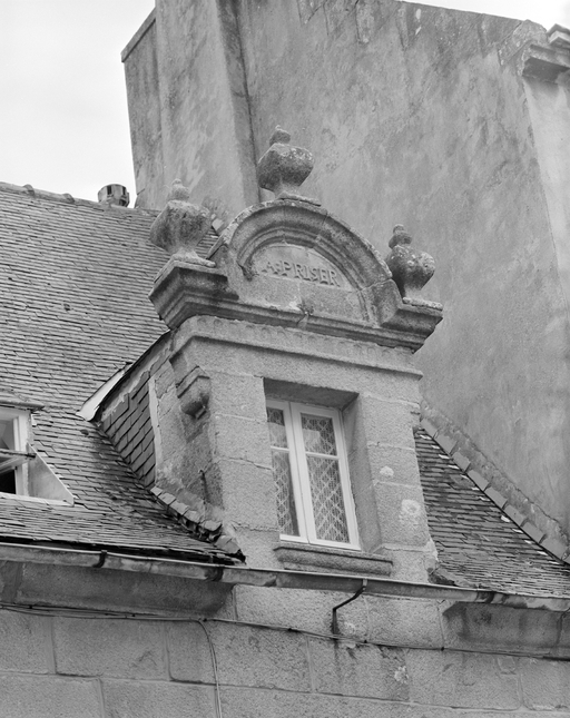 Elévation ouest, détail de la lucarne droite et inscription A : PRISER. (1983)Immatriculation