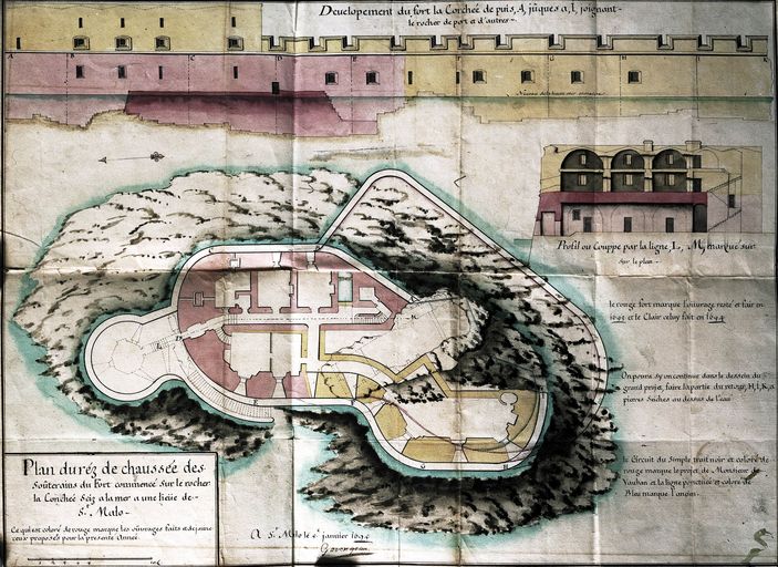 Saint-Malo : développement, coupe et plan du rez-de-chausée du fort de la Conchée, fait à Saint-Malo par Garangeau le 5 janvier 1695Immatriculation