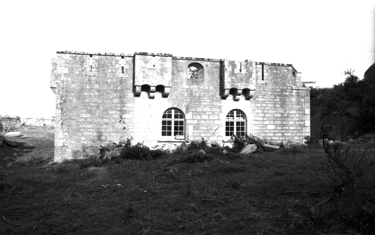 Vue du corps de garde crénelé : élévation orientée vers le sud-ouest (état en 1980). En arrière-plan à gauche, la batterieImmatriculation