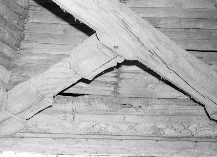 Chapelle : un entrait, deux engoulants et une sablière ornée de végétaux (état en 1984)Immatriculation