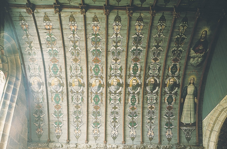 Intérieur de l'église, décor peint, détail des lambris et sablière, croisillon occidental sud, mur ouest.Immatriculation