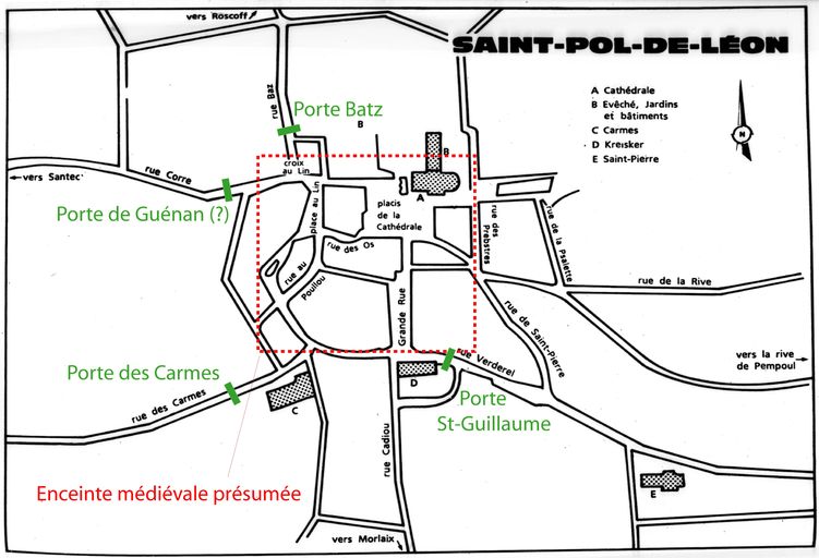 Schéma de l'enceinte présumée et des portes de Saint-Pol-de-Léon (dessin : Jean-Pierre Leguay)Immatriculation