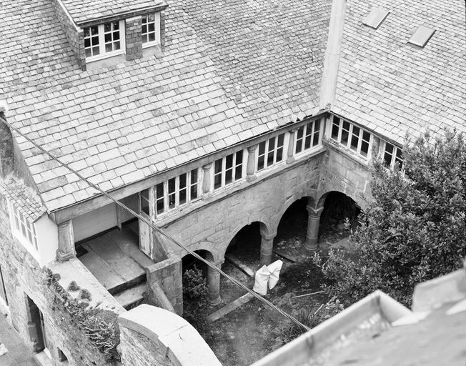 Vue générale prise de la chambre n° 21 de l'Hôtel du Centre : cour et galerie d'arcades en arc plein cintre (état en 1985)Immatriculation