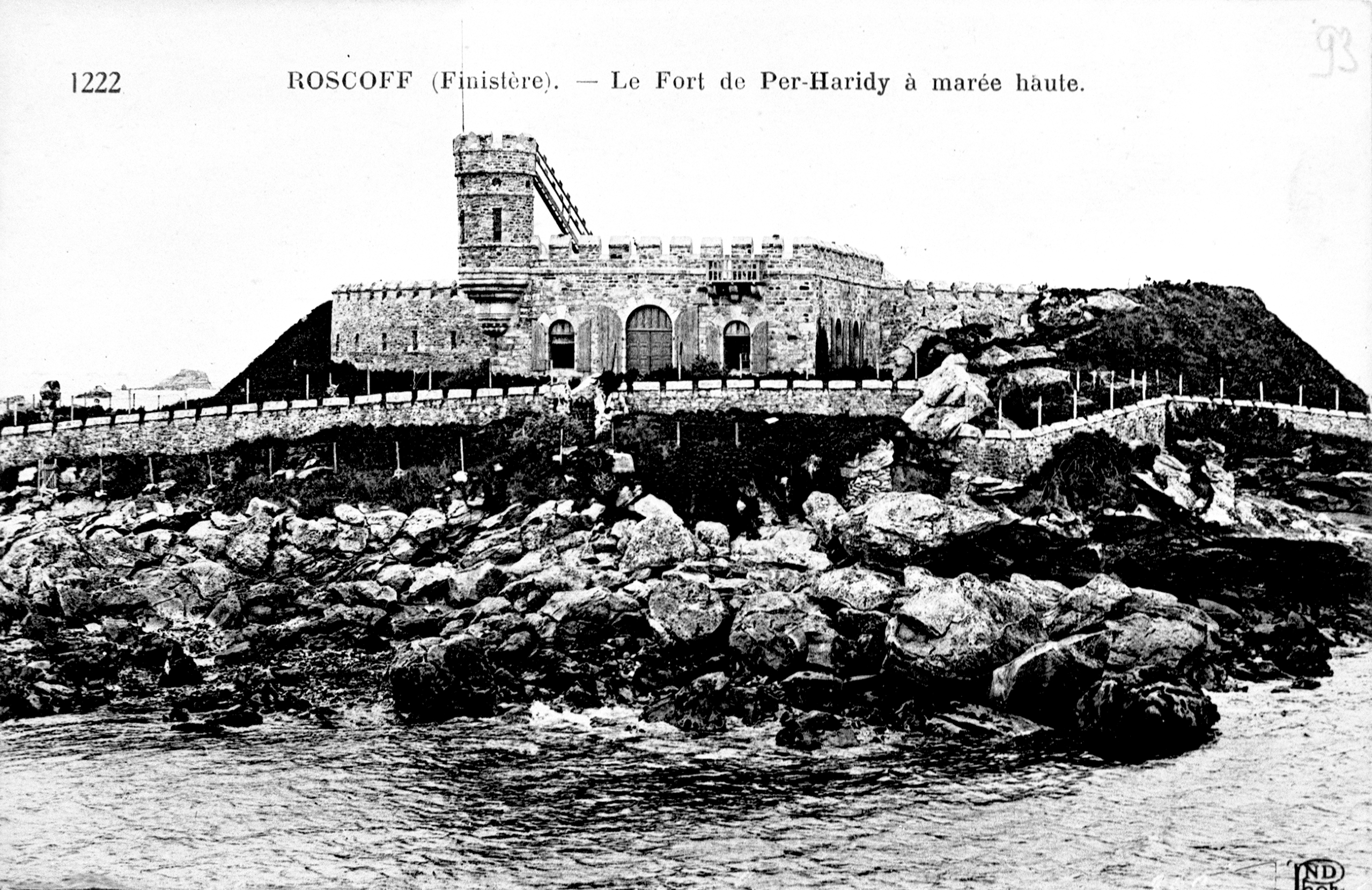 Vue générale à marée haute, carte postale (ND phot.). Légende : Le Fort de Per-Haridy à marée haute. L'ancien corps de garde est flanqué d'une tour créneléeImmatriculation
