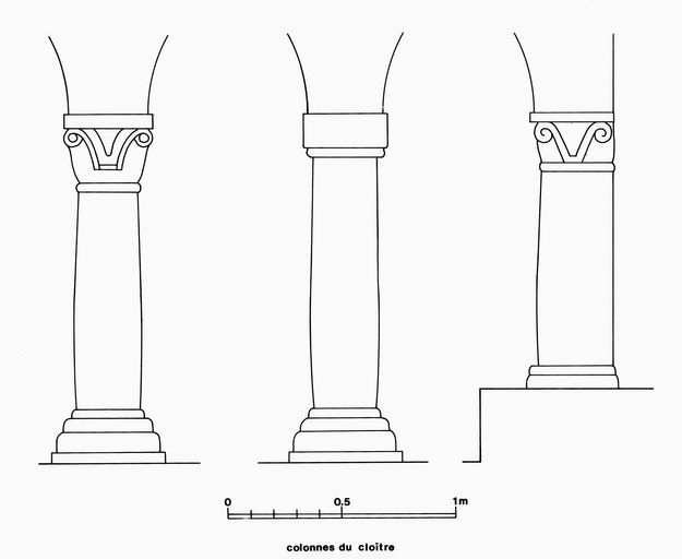 Relevé de trois colonnes de la galerie de la cour : deux présentent un décor particulierImmatriculation