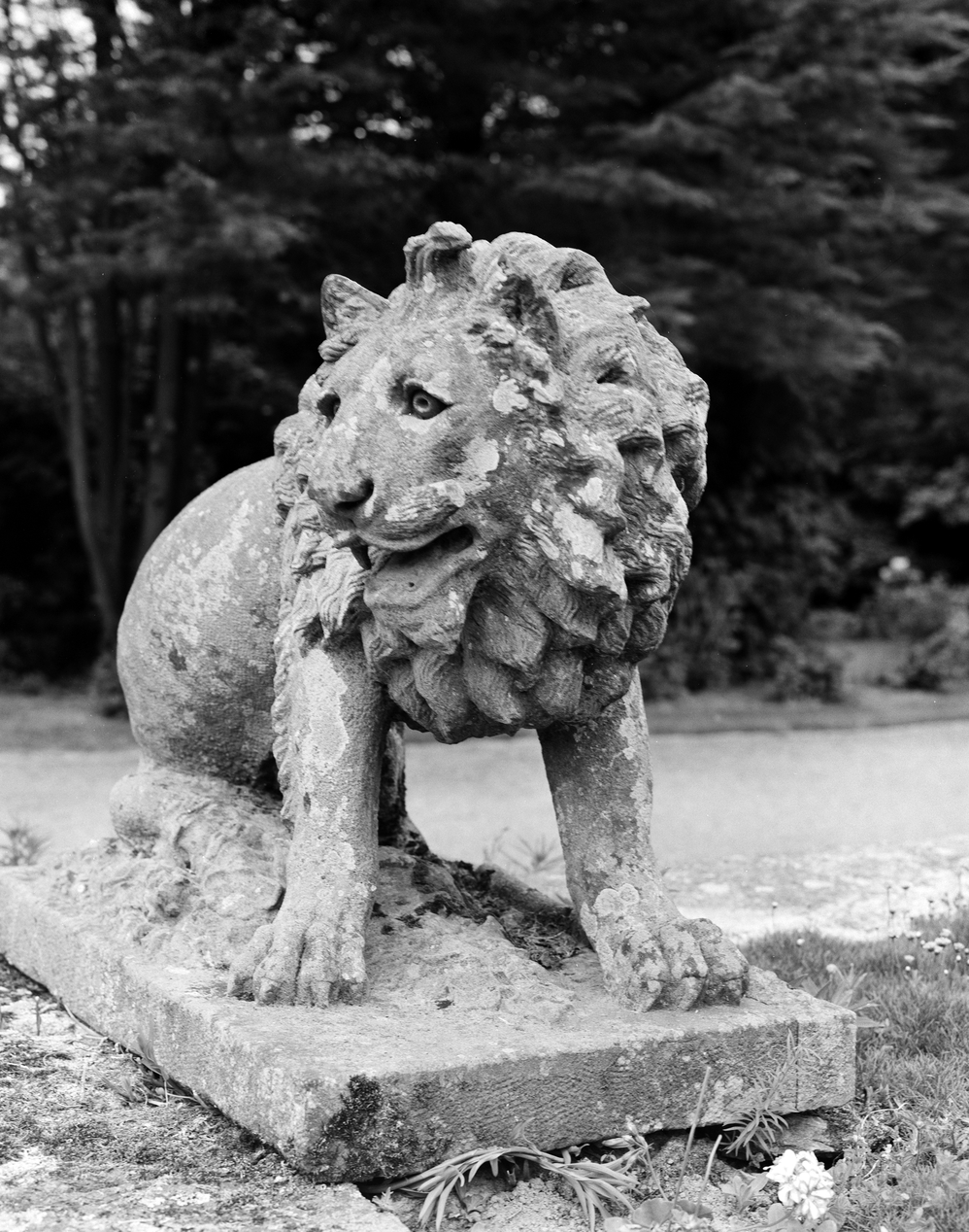 Vue de l'un des lions ornant la terrasse : profil (état en 1986)Immatriculation