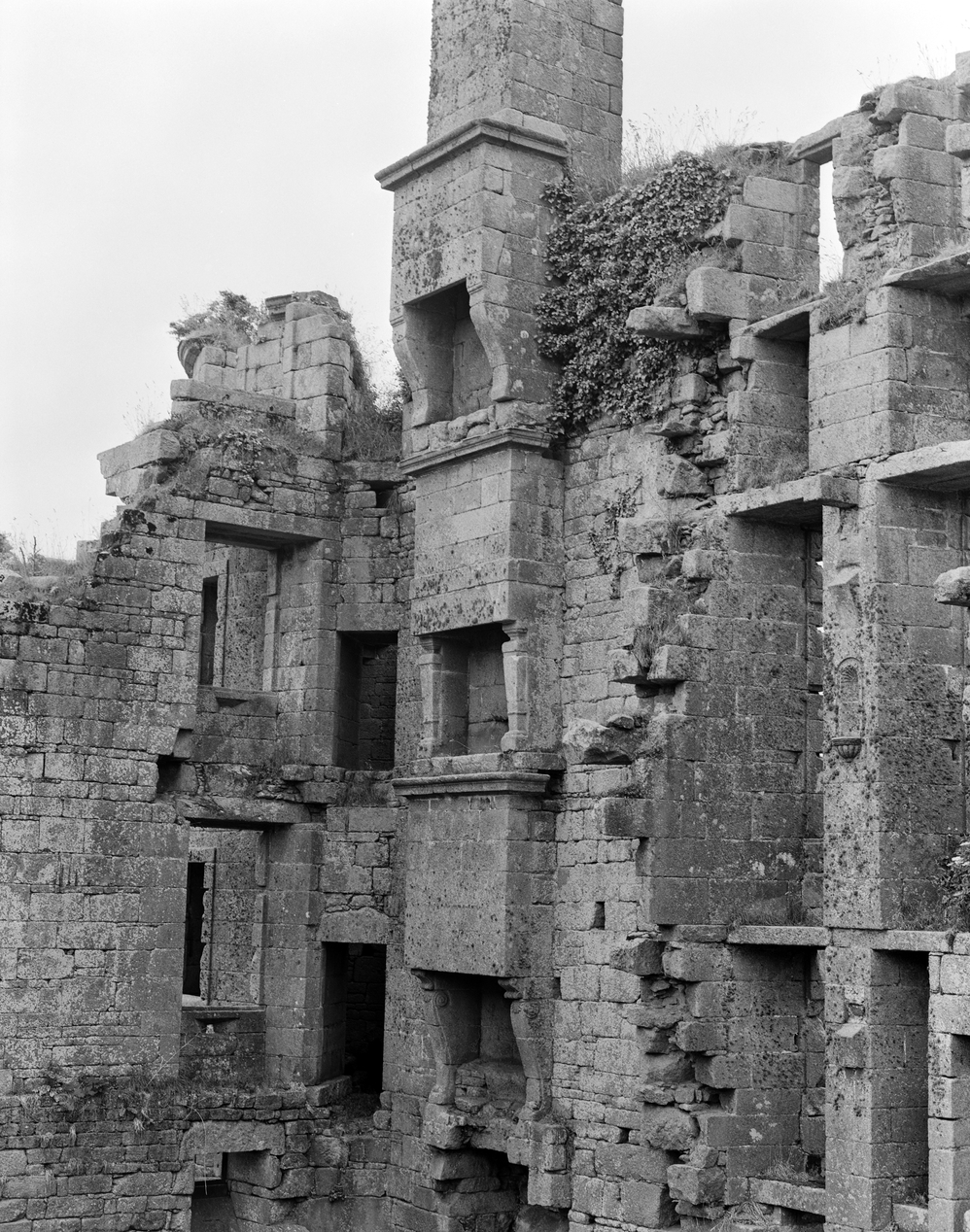 Vue du mur intérieur de la courtine sud-ouest depuis le nord : superposition des cheminées des rez-de-chaussée, premier étage et étage de comble (état en 1986)Immatriculation