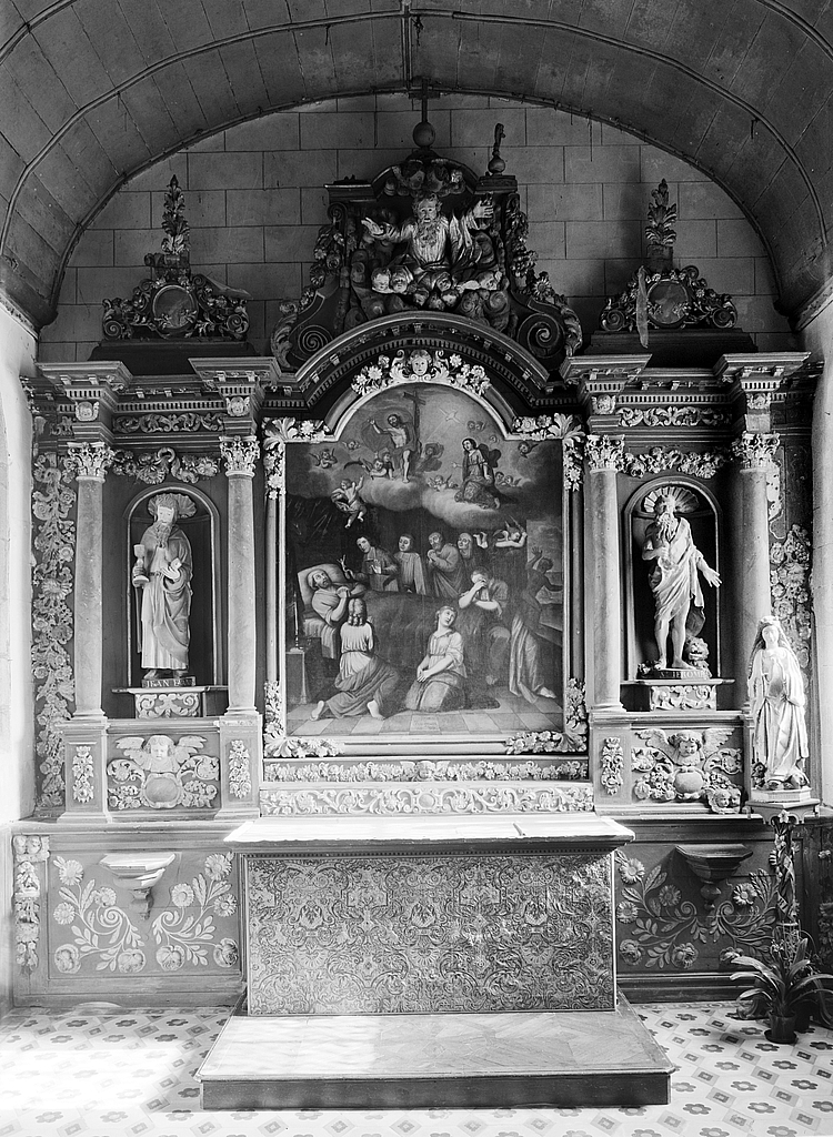Autel, retable, gradins d'autel (2), devant d' autel (autel secondaire, autel tombeau, retable architecturé) : des Agonisants, église paroissiale Notre-Dame-de-Croas-Batz (Roscoff),