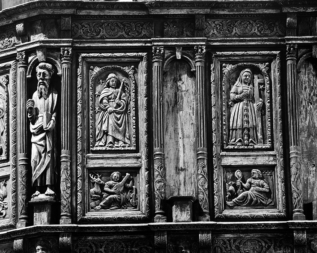 Détail de la tribune, sybille Agrippa, sybille Phrygienne et symbole de l'Orgueil et de la PrudenceImmatriculation