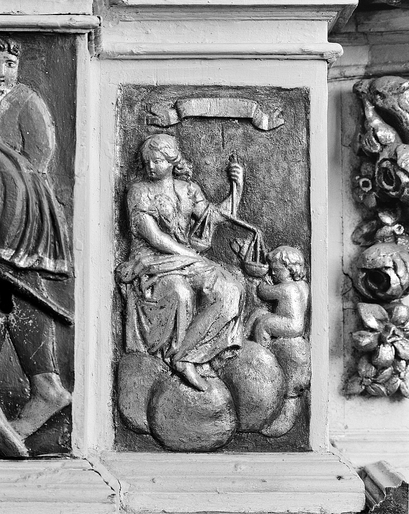 Soubassement du retable, bas-relief de la Justice, vue générale.Immatriculation
