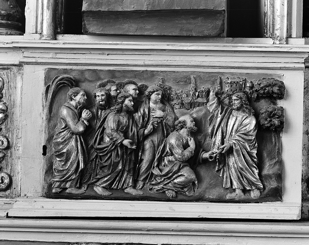 Soubassement du retable, bas-relief, la Remise des clés à saint Pierre.Immatriculation