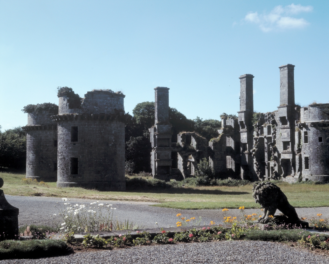 Vue générale depuis le nord et la terrasse du logis (état en 1986). Au premier plan, l'un des lions qui ornent le jardinImmatriculation
